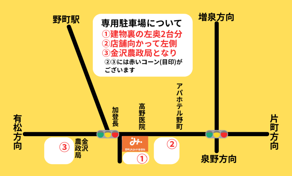 ①院の裏に1台、②院に向かって左側の青空駐車場1番に1台 ③金沢農政局の横の4番に1台計3台準備しています。