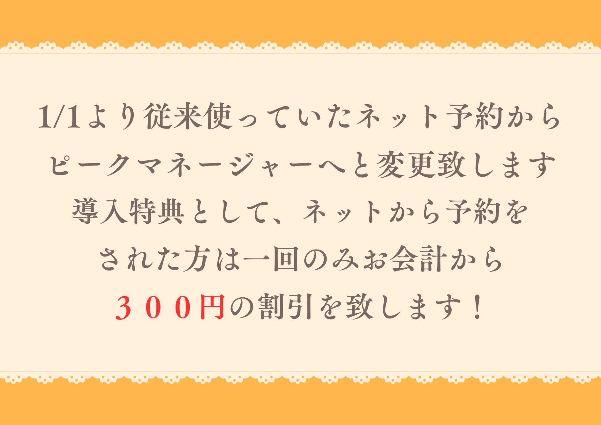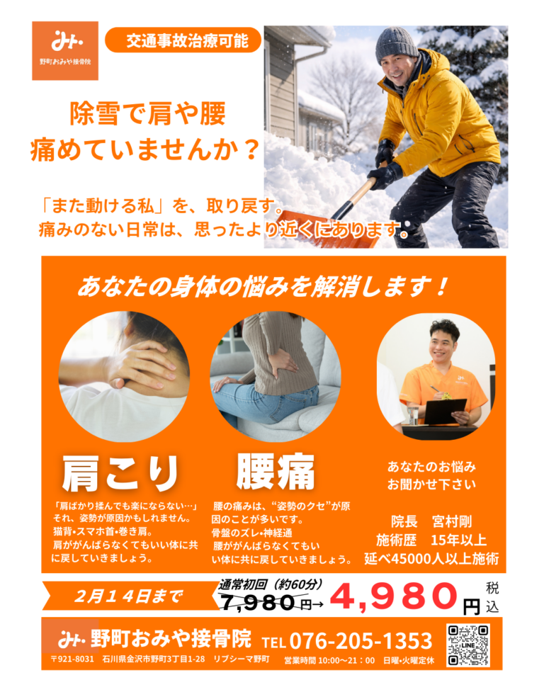 オンライン予約について 投稿日 2025年12月31日 著者 tuyosi miyamura カテゴリー お知らせ 12月30日(火)を持ちまして、野町おみや接骨院は無事に 2025年の営業を終える事が出来ました。 来院された皆様本当にありがとうございました。 来年2026年は1月5日(月)からの営業となります。 来年もまたよろしくお願い致します。 1/1((木))より患者様に寄り添うために、オンライン予約を 強化するために少し変更させていただきます。 今までと少し違いがあるかもしれませんが何卒よろしくお願い致します。 新しい予約リンクは下記になります。 野町おみや接骨院 オンライン予約www.peakmanager.com